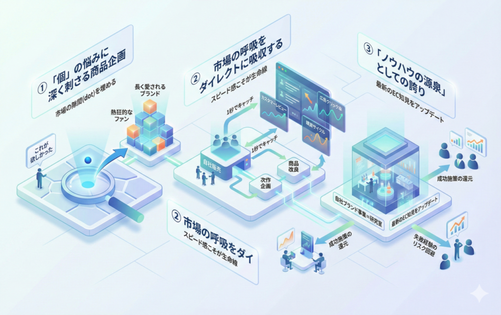 EC市場は日々刻々と変化しています。自らリスクを取ってブランドを運営し、最新のアルゴリズムや顧客心理を直接肌で感じることで、初めて血の通ったアドバイスができると考えています。自社事業で得た「生きたデータ」は、全てパートナー企業の支援に還元しています。